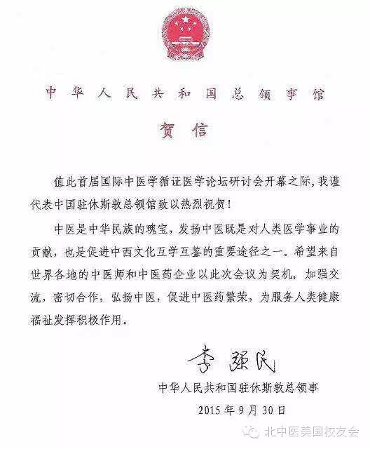 休斯敦总领事馆总领事李强民先生发来热情洋溢的贺电:中医是中华民族的瑰宝,发扬中医既是对人类医学事业的贡献,也是促进中西文化互学互鉴的重要途径之一。大家加强交流,密切合作,弘扬中医,促进中医药繁荣,为服务人类健康福祉发挥积极作用。